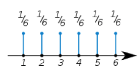 p(x=1) = 1이 될 확률. 이때, n = 6이라고 가정한다면, $\frac{1}{6}$ 이다. 그러한 1~6까지는 확률이 모두 같아야 한다.