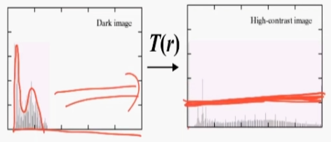 입력의 히스토그렘 모양을 바꿔주는것. 모든 픽셀값의 범위가 동일한 값을 가지도록 transformation function 을 이용해 계산해주는것 log, power low 등의 방법을 이용한다.
