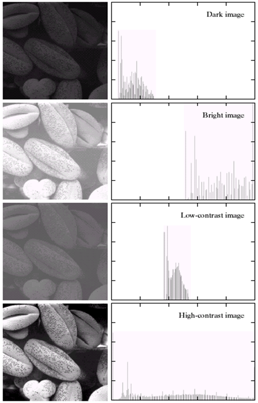 이미지의 위부터 3번째까지의 이미지는 히스토그램이 전반적으로 고르게 분포되어 있지 않기 떄문에 대비가 높은 영상 이라고 할 수 있다.