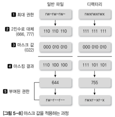 마스크 값은 파일이나 디렉터리 생성 시 부여하지 않을 권한을 지정함.