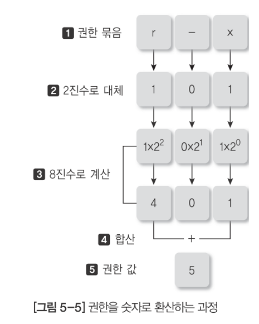r-x 라고 할 때 권한이 있는 것은 1로, 없는것은0 으로 변환