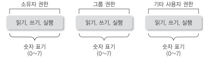 읽기 권한, 쓰기 권한, 실행 권한 세가지로 구성됨