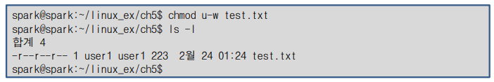 | u-x | 소유자(u)에게 쓰기(w) 권한 제거(-) |