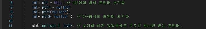 nullptr_t 를 사용하면 포인터를 nul로 초기화할 수 있다.