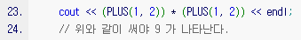 즉, 매크로로 변환하여 사용하는 것은 괄호가 들어가지 않아. 정상펑션 대로 사용하면, 1+2의 결과가 나온 3이 다음 1+2의 결과와 곱해져 9가 나와야하는것이, 1 + 2 * 1 + 2 가 되어, 의도와는 다른 결과가 나타나는 것을 확인할 수 있다.