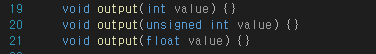 위와 같은 방식으로 output 함수를 생성하고, 각각 다른 int, unsinged int, float 으로 구성된 함수를 만들었다는 가정 하에