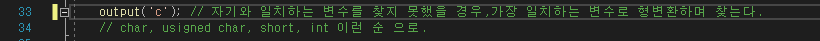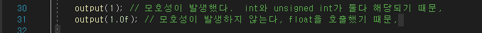 30번째 줄 을 실행 시 output 1을 호출하나, int와 unsinged int 두개 전부 해당됨 으로 모호성 문재가 발생한다. 이를 유의하여 사용하여야 한다.