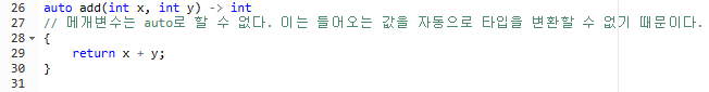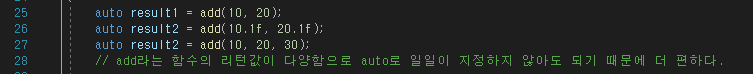 펑션을 선언하고, 펑션에도 auto를 넣어줄 수 있다. 리턴값을 정해주지 않고, 나중에 return을 사용자 임의로 줄 수 있기 때문에 편리하게 코드를 작성할 수 있다.