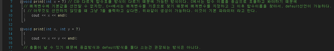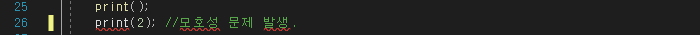26번째 줄 과같이 2를 넣고 선언하였을 경우, 컴퓨터는 print(int x = 7) 의 x에 2를 넣은것 인지, print(int x, int y = 7)의 x에 2를 넣은것 인지 판단할 수 없음으로 모호성 문재를 발생시킨다. 그렇게 됨으로써 오류가 발생할 수 있으니, 이와같은 방법은