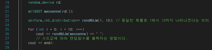 그 후, uniform_int_destribution<>에서 reNUJm의 범위를 지정하여, 일정 수 내의 범위 의 수 가 생성되도록 재한한다.