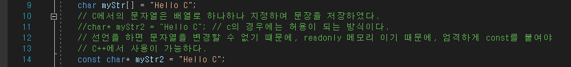 C는 위와 같은 방식을 사용하여 배열에 문자를 하나씩 넣는방식으로 데이터를 참조하여 출력할 수 있다.