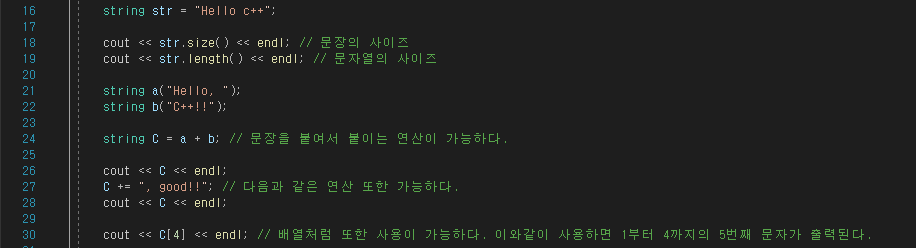 C++에서는 다른방법인 string을 사용한다. 다음 예시를 살펴보자.