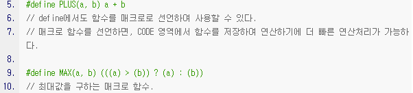 매크로 함수로 선언하면 CODE영역에서 함수를 저장하여 연산하기에 더 빠른 연산 처리가 가능하다.
