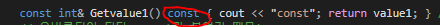 위 const 부분은, 함수를 프로그래머가 가독성을 향상시킬 목적으로 기입한다. 함수의 반환값의 형태에 영향을 끼칠 수 없지만, 프로그래머는 앞에 const가 붙은것 을 봄으로써, 상수 멤버 함수 임을 알 수 있다. 상수멤버 함수는 해당 멤버 함수가 객체의 멤버 변수를 변경하지 않음을 보장한다.