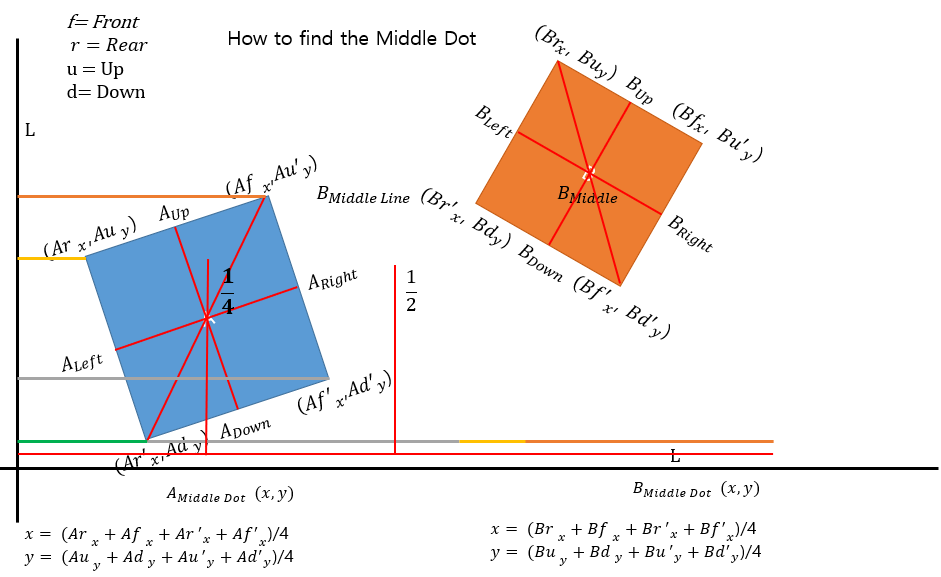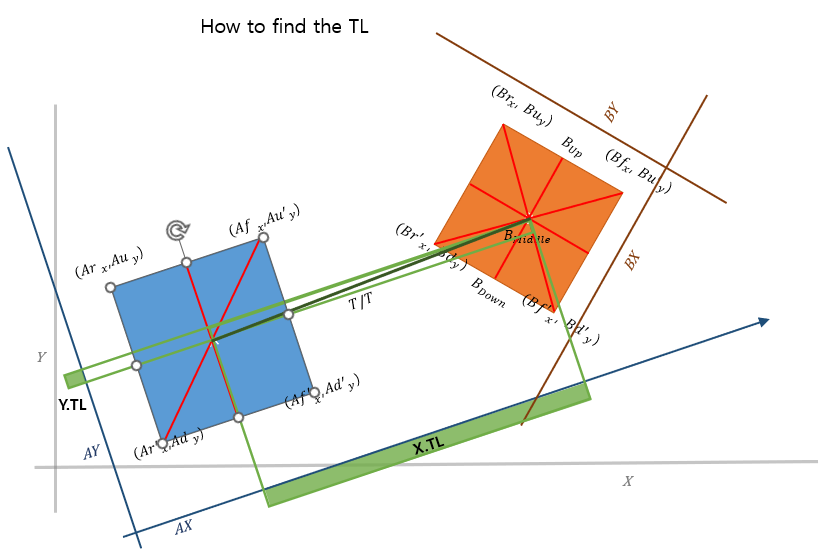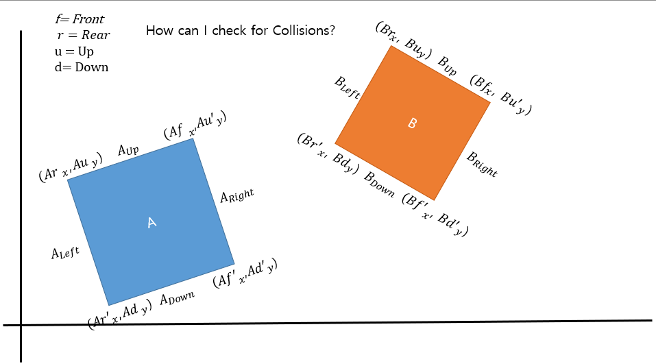 계산식 상 축이 정렬된 객체 기준으로 작성되어 있기 때문에, 축이 회전되어있다 라고 가정한다면 회전체에 대한 접근이 불가능하다. - 사각형 에 대한 객체충돌 검사만 가능하다.