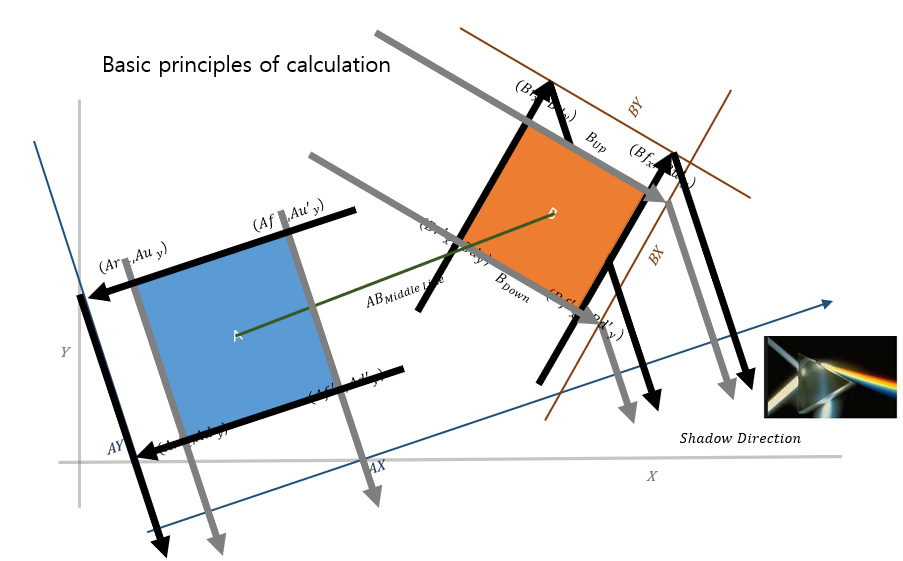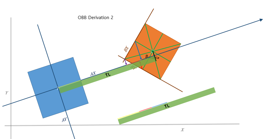 - 두 객체의 OBB가 겹치는지 확인한다. 이를 위해 Separating Axis Teorem(분리 축 정리) 을 사용하여 OBB의 로컬 축들을 기준으로 프로젝션을 수행하고, 프로젝션 범위를 비교한다.
