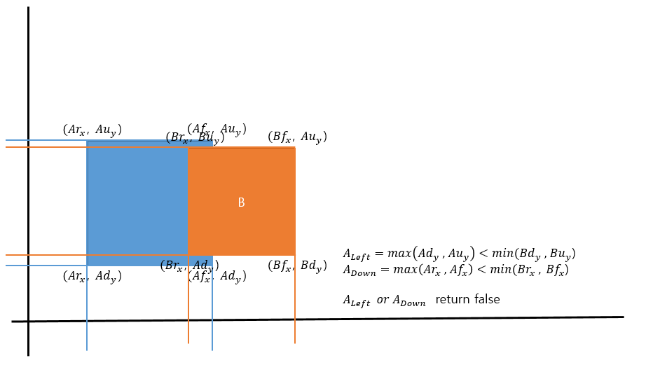 AABB의 겹침 여부는 각 축의 범위를 비교하여 판단한다. X축과 Y축의 범위가 겹치는지를 서로 비교하여 판단하게 된다. - 모든 축에서 겹침을 확인하면, 두 객체는 충돌한다고 간주한다. 그렇지 않았다면 두 객체는 충돌하지 않았다고 판단한다.