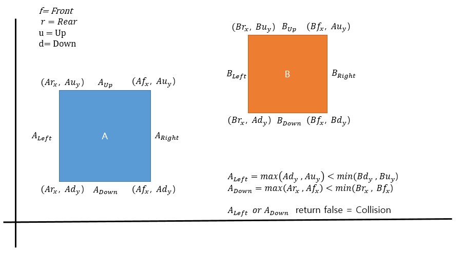 축이 정렬된 바운딩 박스 ( Axis-Aligned Bounding Box)를 이용하여, 두 객체가 충돌하는지를 파악하는 간단한 알고리즘이다.