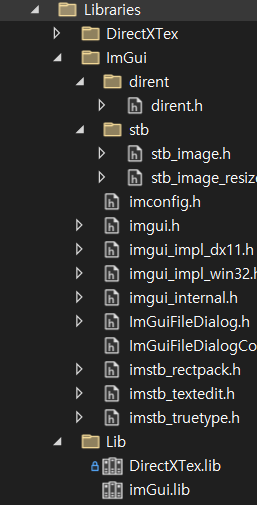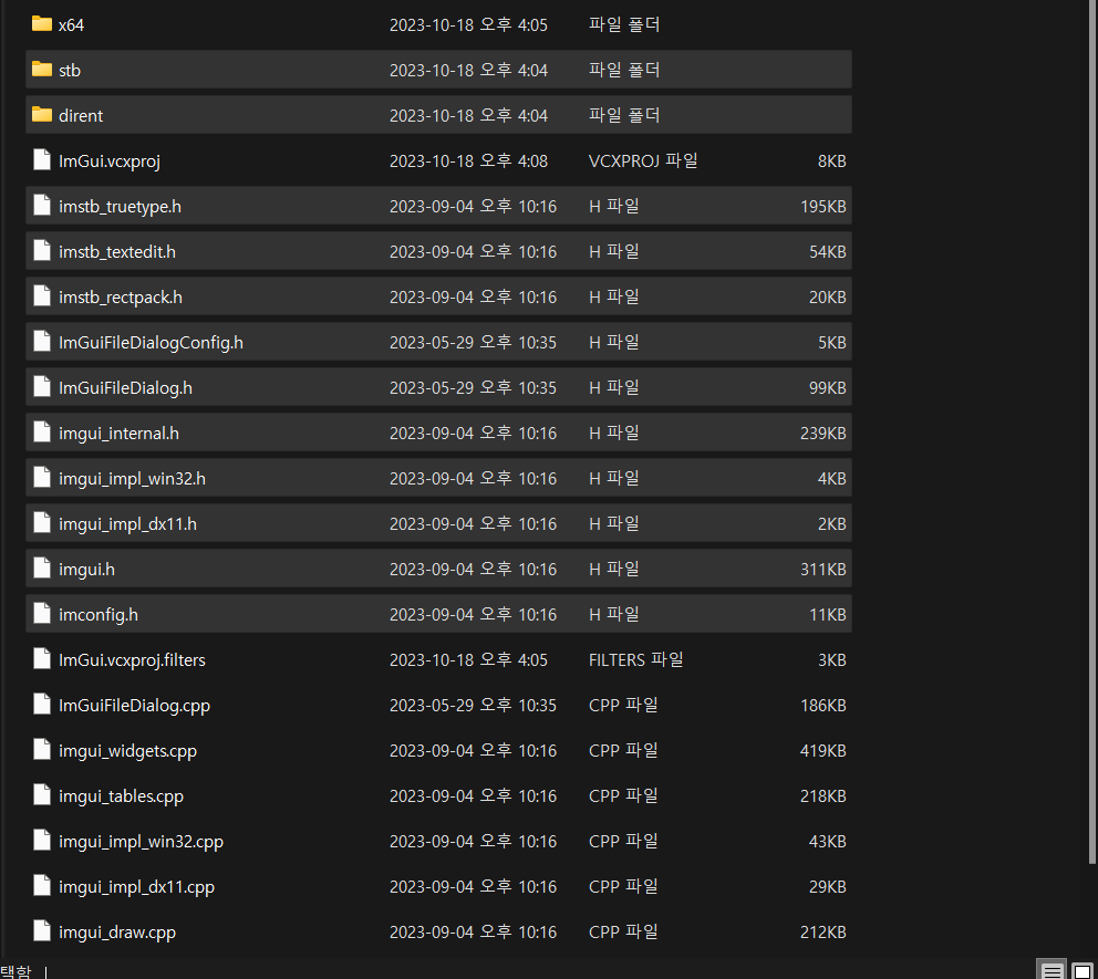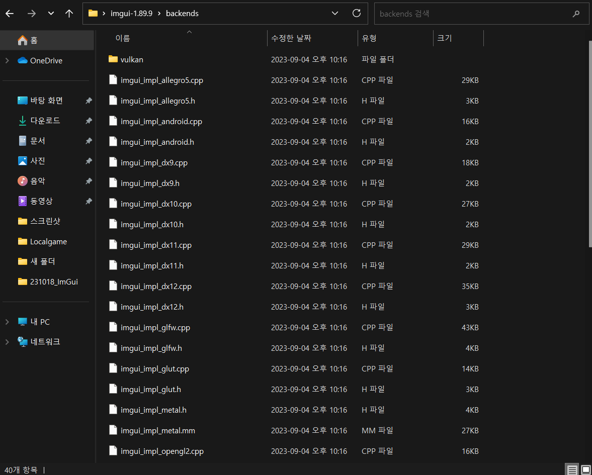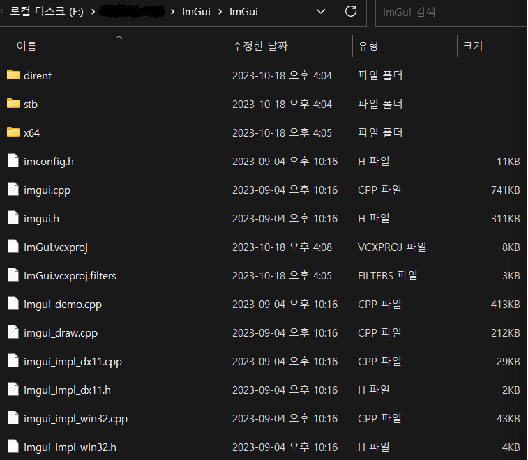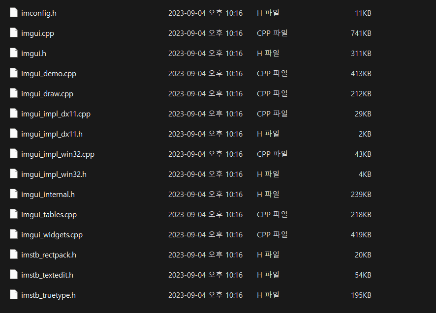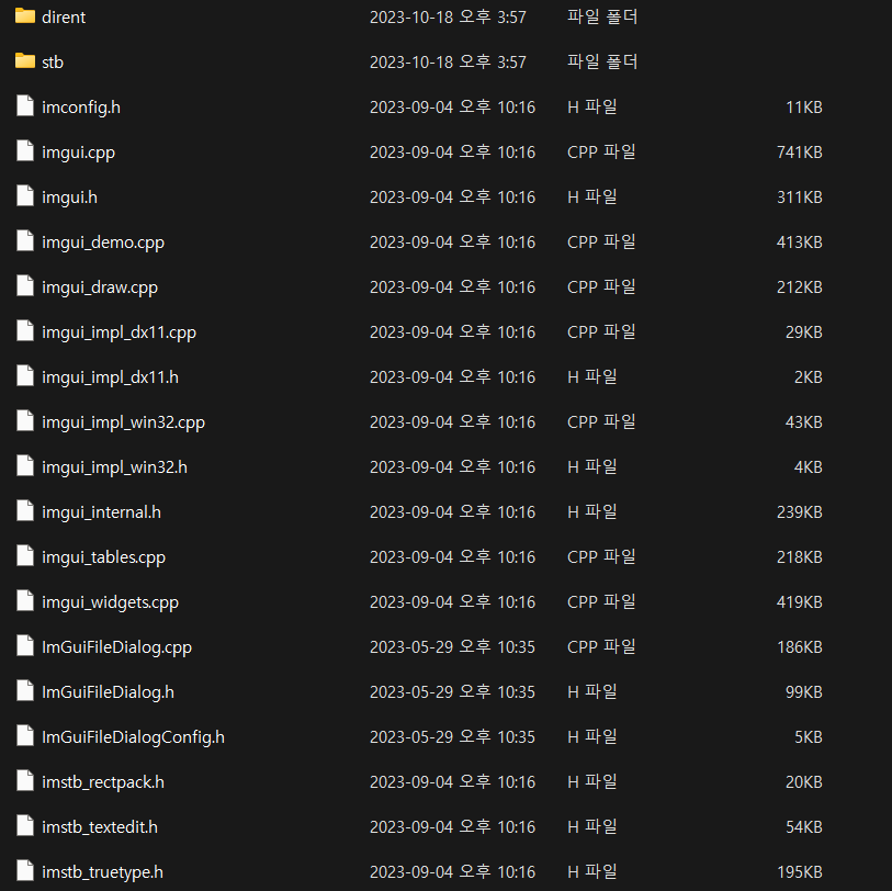 모아놓았던 파일중 .h파일만 따로 모아서. ImGui라는 폴더로 만들어 관리해주면 된다.