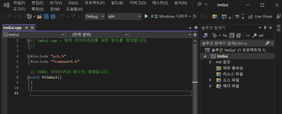 전부 날렸으면 우리가 폴더에 따로 모아놓았던 .h와 .cpp파일들을 만들었던 정적 라이브러리 솔루션에 넣어준다.