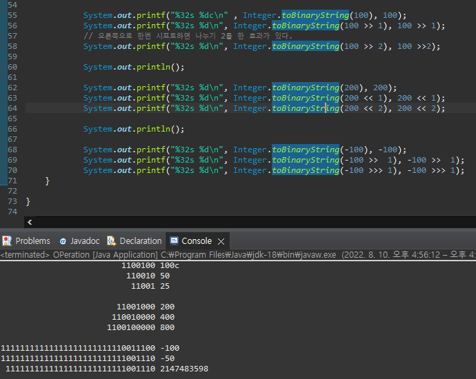 - >> : 비트를 오른쪽으로 이동시켜주는 연산 ( 부호를 유지시켜 준다)