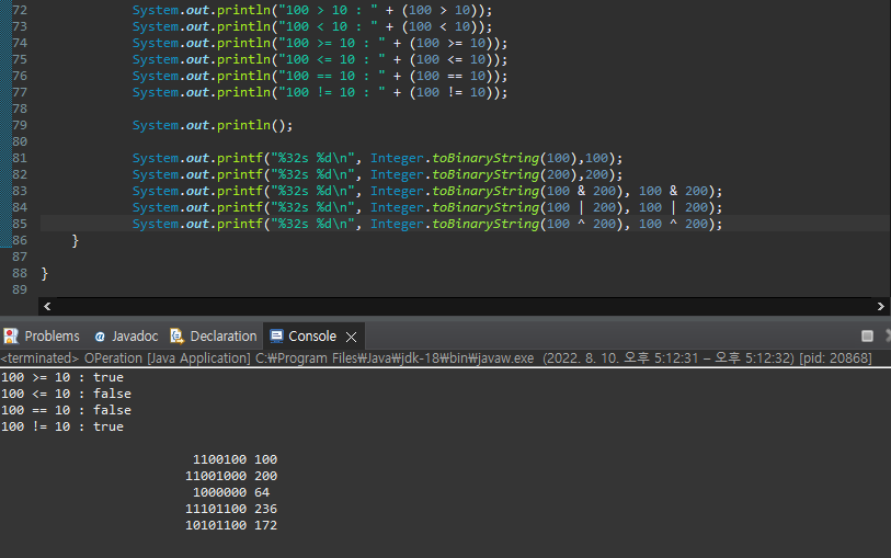 - < : 좌측의 값이 우측의 값보다 작으면 true, 크거나 같으면 false