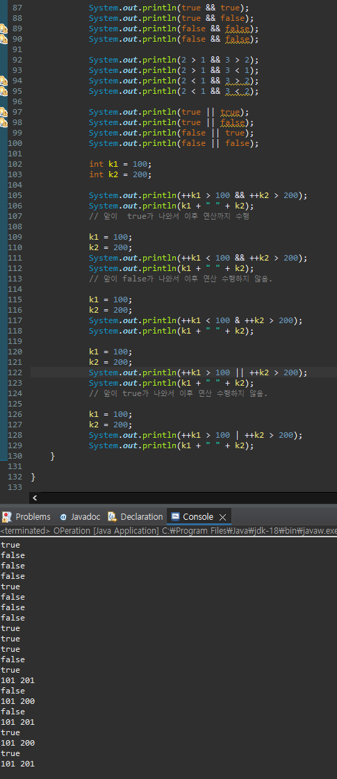- && : 연산자를 기준으로 좌측과 우측에 관계 연산자가 있을 경우 두 값이 모두 true 이면 true, 하나라도 false 이면 false를 반환한다. 좌측의 연산 결과 값이 false 라면 이 후의 연산은 수행하지 않고 false 를 반환한다.