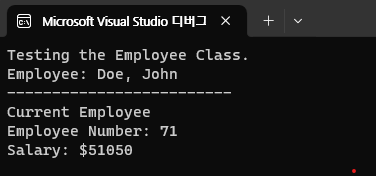 Employee 클래스는 자신의 정보를 출력하는 메서드, 급여와 직급을 조정하는 메서드를 제공한다.
