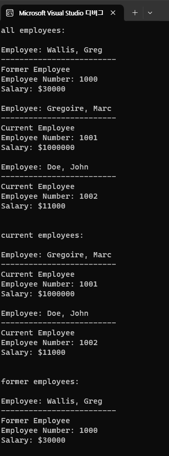 display또한, 해당되는 객체의 모든 항목을 display호출하여 종업원 정보를 콘솔에 출력한다.