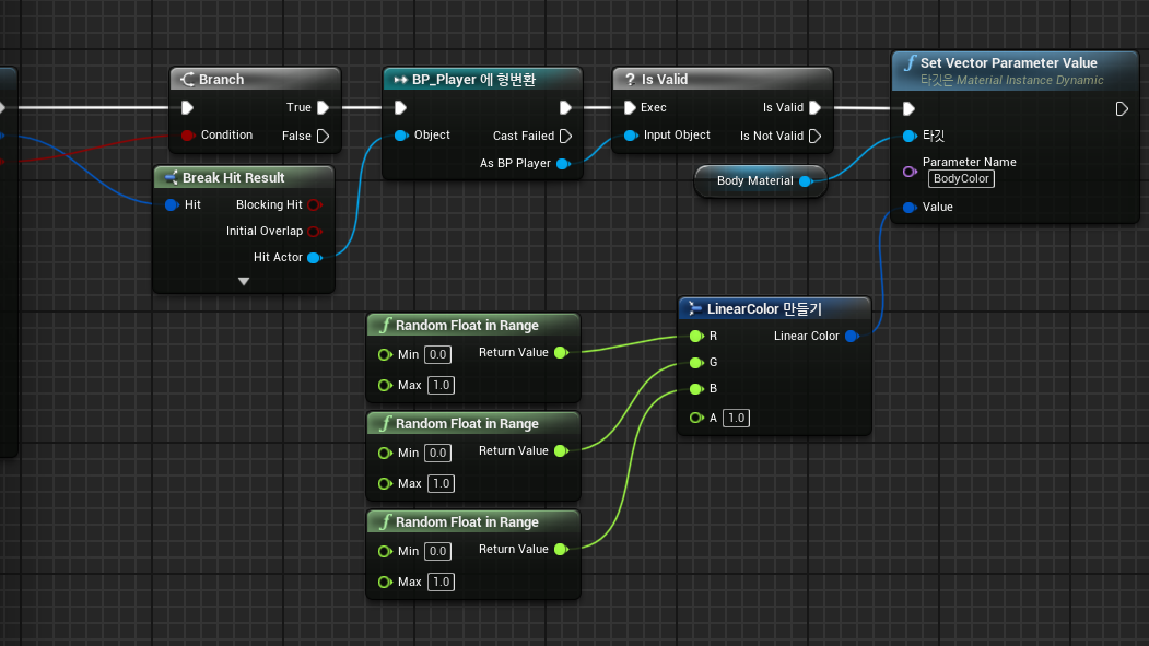 이제, BP Player에 대해 IsValid를 검사하여, 변환이 가능할경우, False가 아닐경우, VectorParameterValue에서 BodyColor값에 개입하여 Color를 변환해주면 된다.