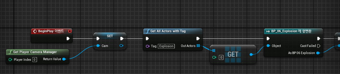 현재 우리는 0번째 객체만 다룸으로, 0번째 객체를 받아온 다음, 해당 객체를 BP_Explosion으로 형변환 한다.