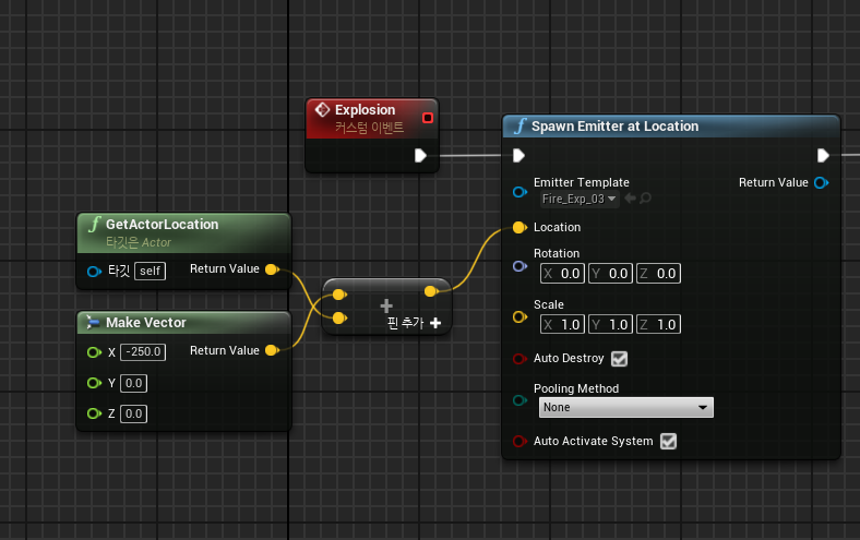 Explosion 커스텀 이벤트를 정의하고, 해당 이벤트가 실행되었을 때 에는 SpawnEmiter at Location을 실행하여, 폭발 이팩트를 실행시킨다.