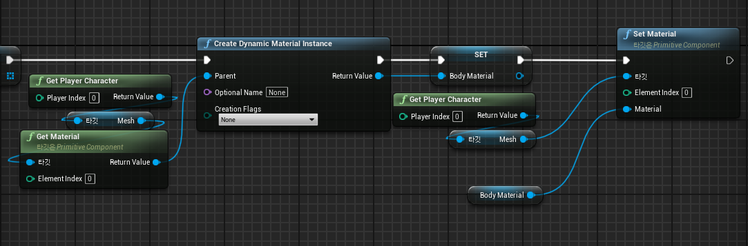 시작할 때, Player객체를 확인하고, 해당 객체의 Mesh데이터를 참고하여 Material을 변수로 받아온 다음, 해당 캐릭터의 Mesh데이터를 참조하여 Mesh데이터를 새로만드는 DynmaicMaterial instance로 변환해준다.