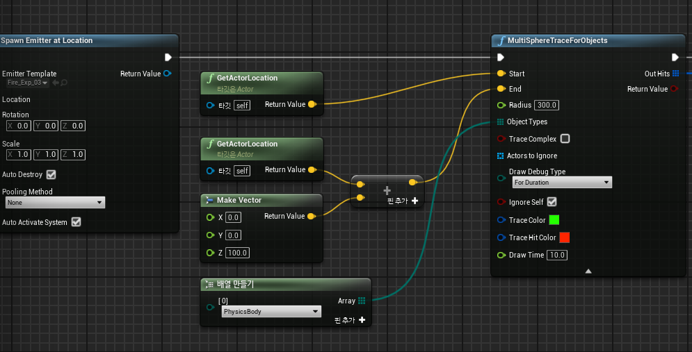 이미 폭발을 정의 하였음으로, 폭발 위치를 기준으로 300범위만큼의 구체를 생성하여, 그 구체와 충돌한 객체들을 OutHits로 반환한다.