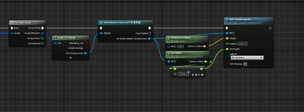GetActorLocation의 위치 부터 반경 300기준으로 GetMass를 통해 받아온 Actor의 중량을 가져온 다음 중량값에 대해 1000만큼 곱한값을 충격힘으로 원을 기준으로 바깥쪽을 향해 힘을 부여한다.