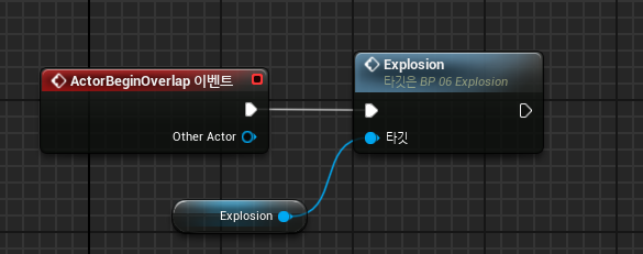 그리고, Explosion에 들어있던 커스텀 이벤트를, Actor BeginOverlap이벤트가 실행되었을 때, 호출하면 된다.