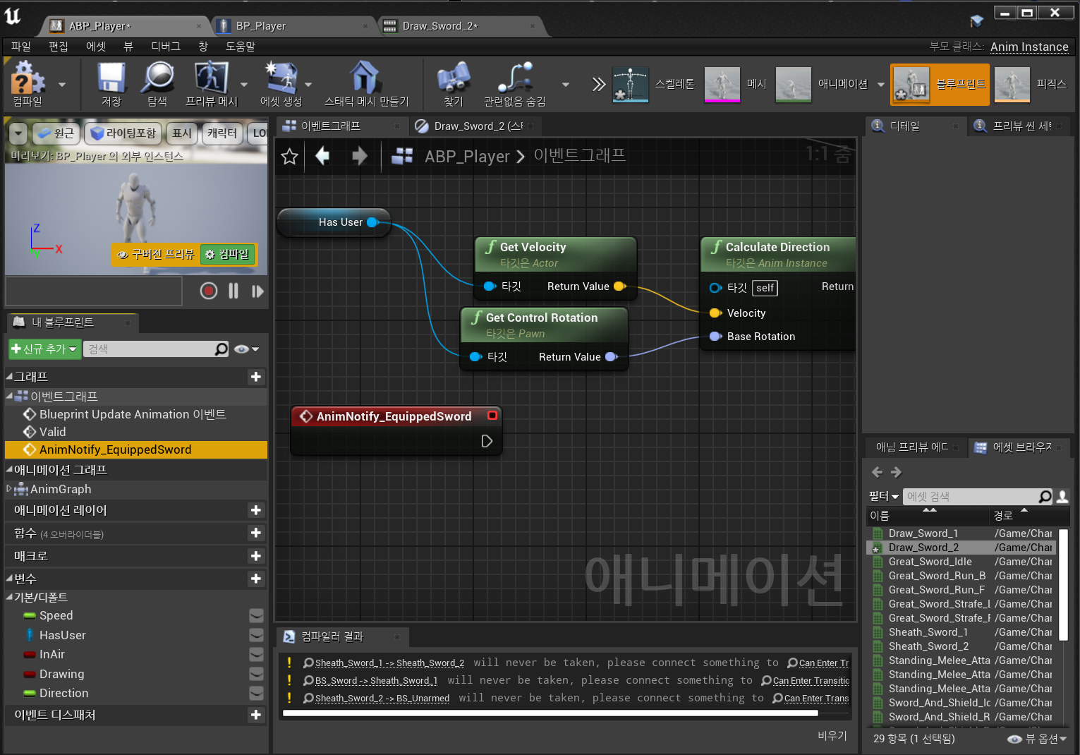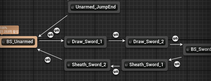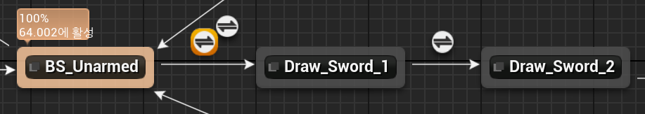 원래 BS_Unarmed의 상태에서 Draw Sword_1 -> DrawSword_2로, 마지막은 Bs_Sword로 이동하여 블랜드 스페이스를 사용할것 이다.