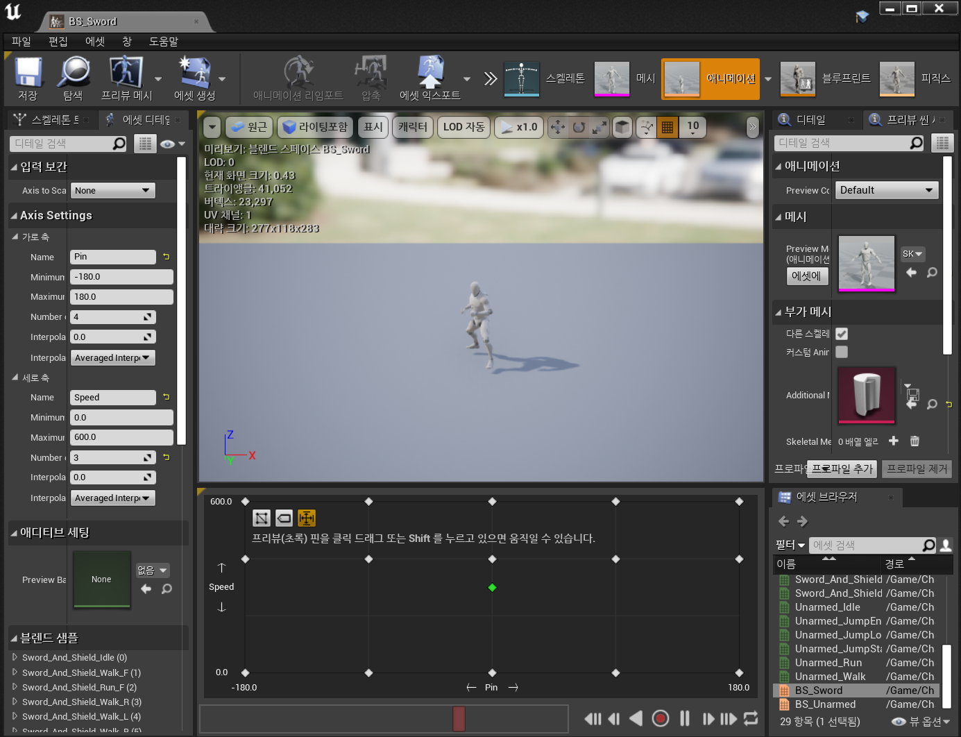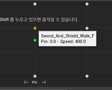 이미 기본이동에서 달리기 모션은 600의 속도, 걷기는 400까지로 정의하였음 으로 각 위치에 모션을 배치해주면 된다.