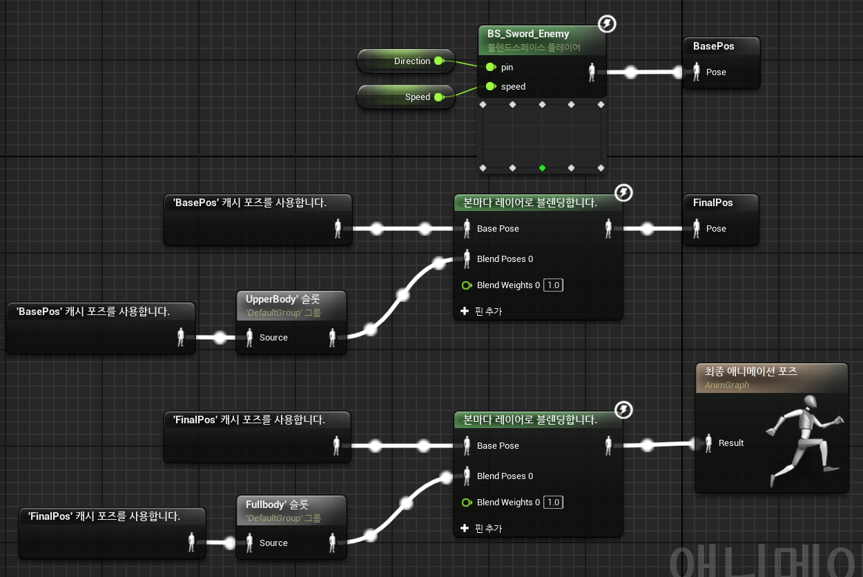 기본 애니메이션은, BS_SwordEnemy를 통해 재생되고, 해당 애니메이션을 기준으로, UpperBody, 그 이후 FullBody로 연결되며 재생된다.