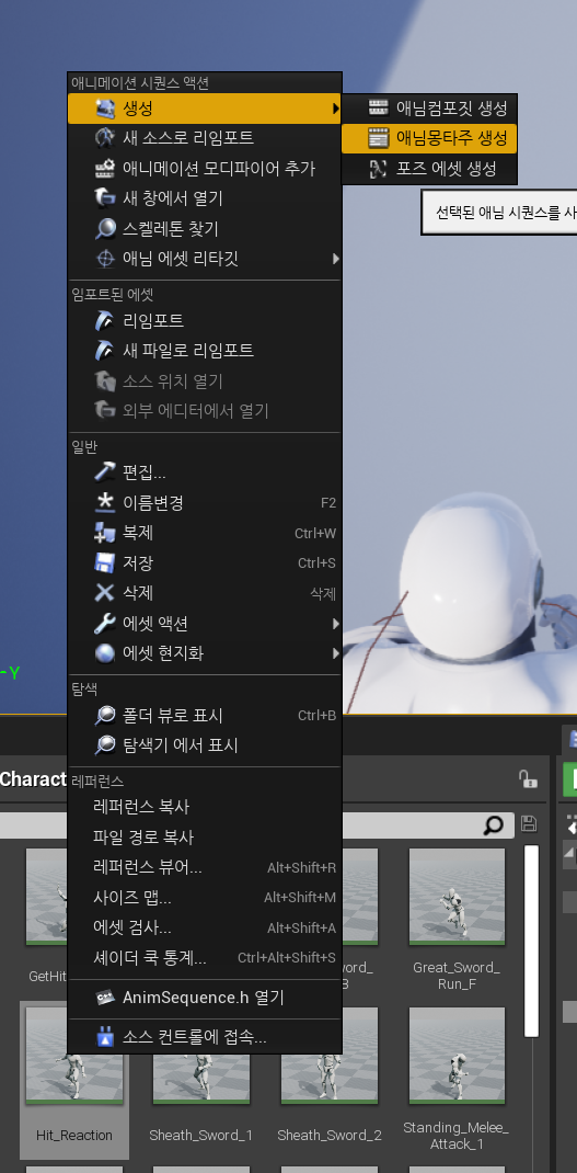 우선, 피격 애니메이션을 정의할 몽타주를 새로 생성한다.