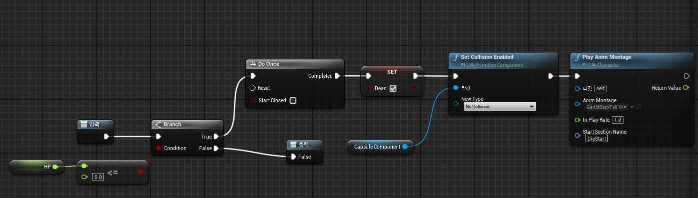 먼저, HP가 0보다 작거나 같은지 확인하고, 참일 경우, Do Once를 통해 한번만 재생되도록 해준 뒤, Bool변수로 Dead에 체크하고, 죽었을 경우, 충돌처리가 진행되면 안되기 때문에, 충돌관련 타입변수를 NoCollision으로 바꾸어준다.