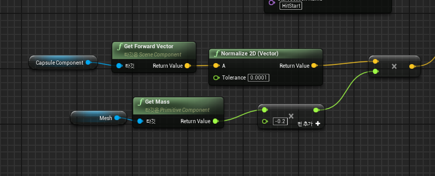 더해지는 방향은 위와 같다. 캡슐의 앞부분을 가져와서 2D방향으로 Normalzie해주고, Mesh의 중량값을 가져와서 -0.2만큼 곱해주면, 뒤방향으로 중량의 0.2만큼 밀리게 된다.