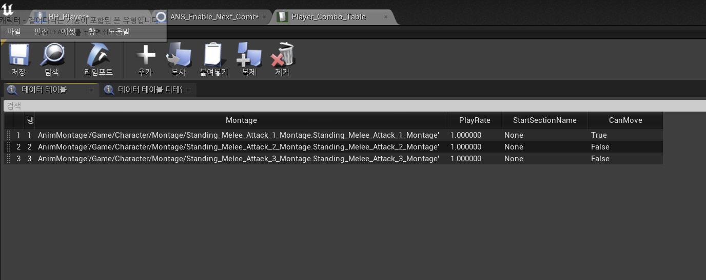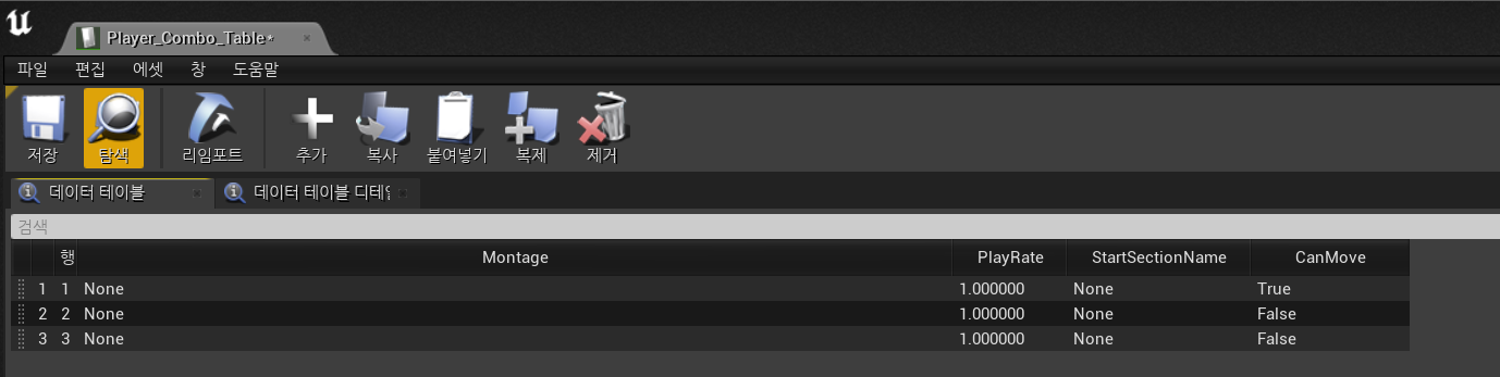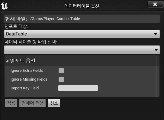 위 데이터테이블 옵션에서, 데이터테이블 행 타입 선택을 통해 우리가 방금 만들었던 데이터테이블 행 타입을 선택하여, 순서대로 데이터를 받아와 구조체를 만들면 된다.
