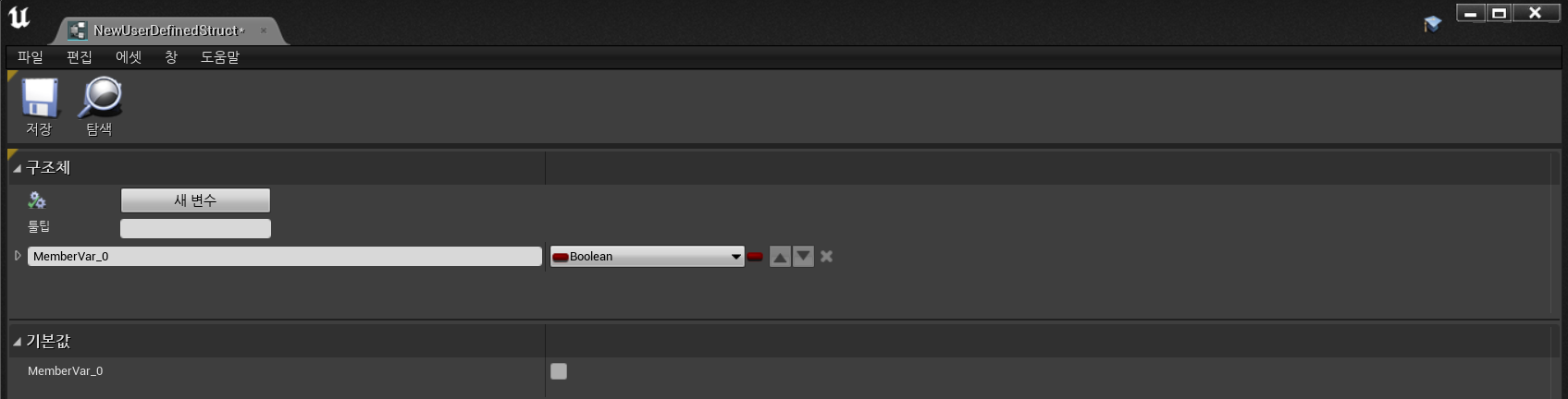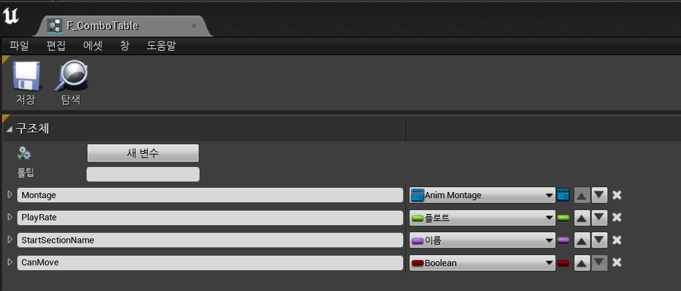 현재 구조체의 데이터타입은, 1번은 몽타주 두번째는 플롯, 세번째는 이름(FString) 네 번째는 Boolean형태로 이루어져 있음을 알 수 있다.