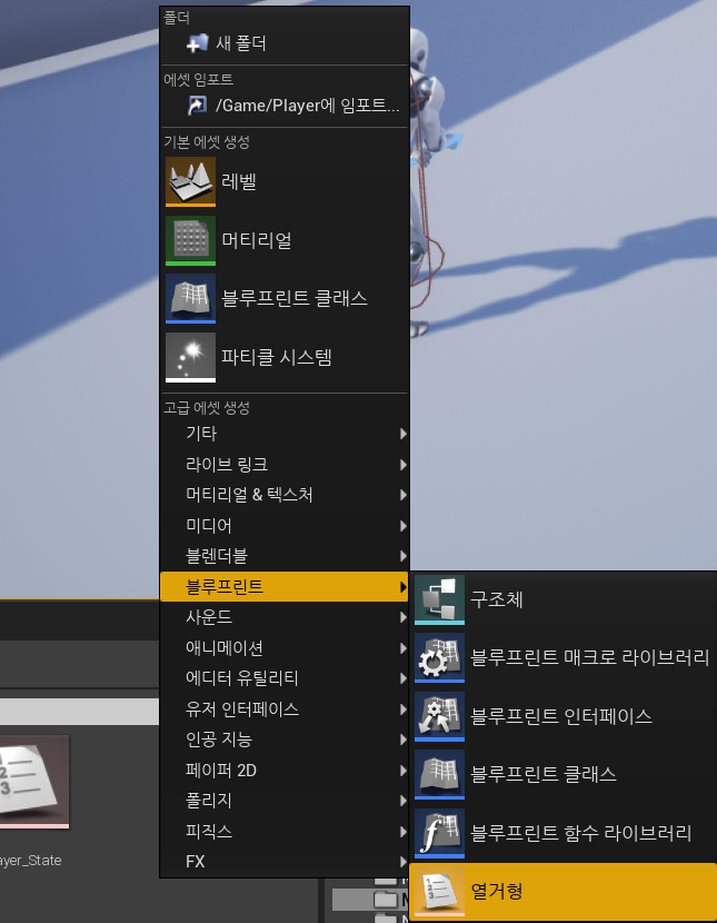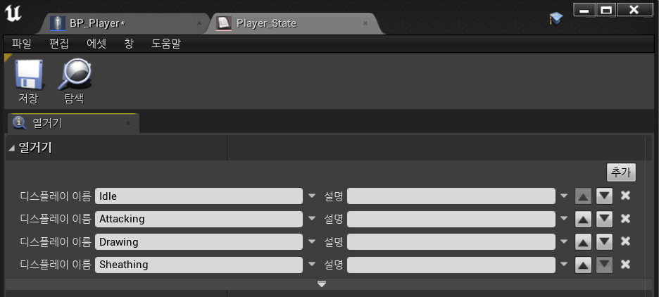 우선 블루프린트-> 열거형 을 통해 Enum을 사용할 때 어떤 형태로 사용할 것인지 정의해준다.
