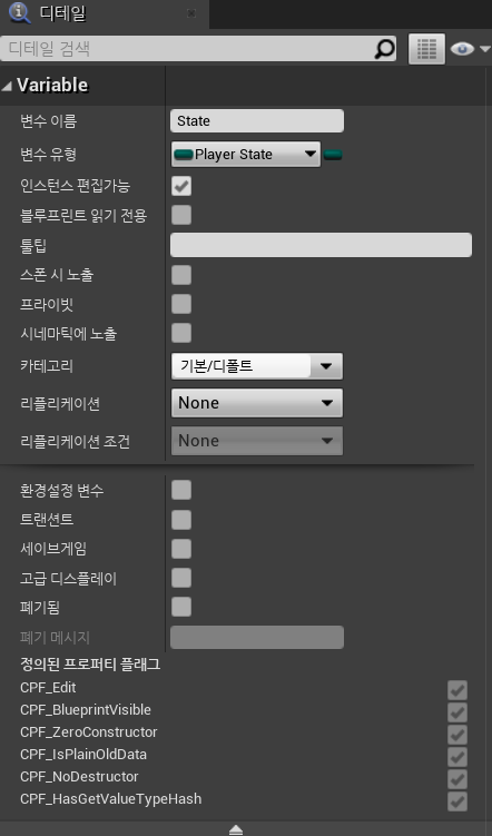 변수 추가후, 디테일창에서 우리가 만든 Enum을 지정해주자.