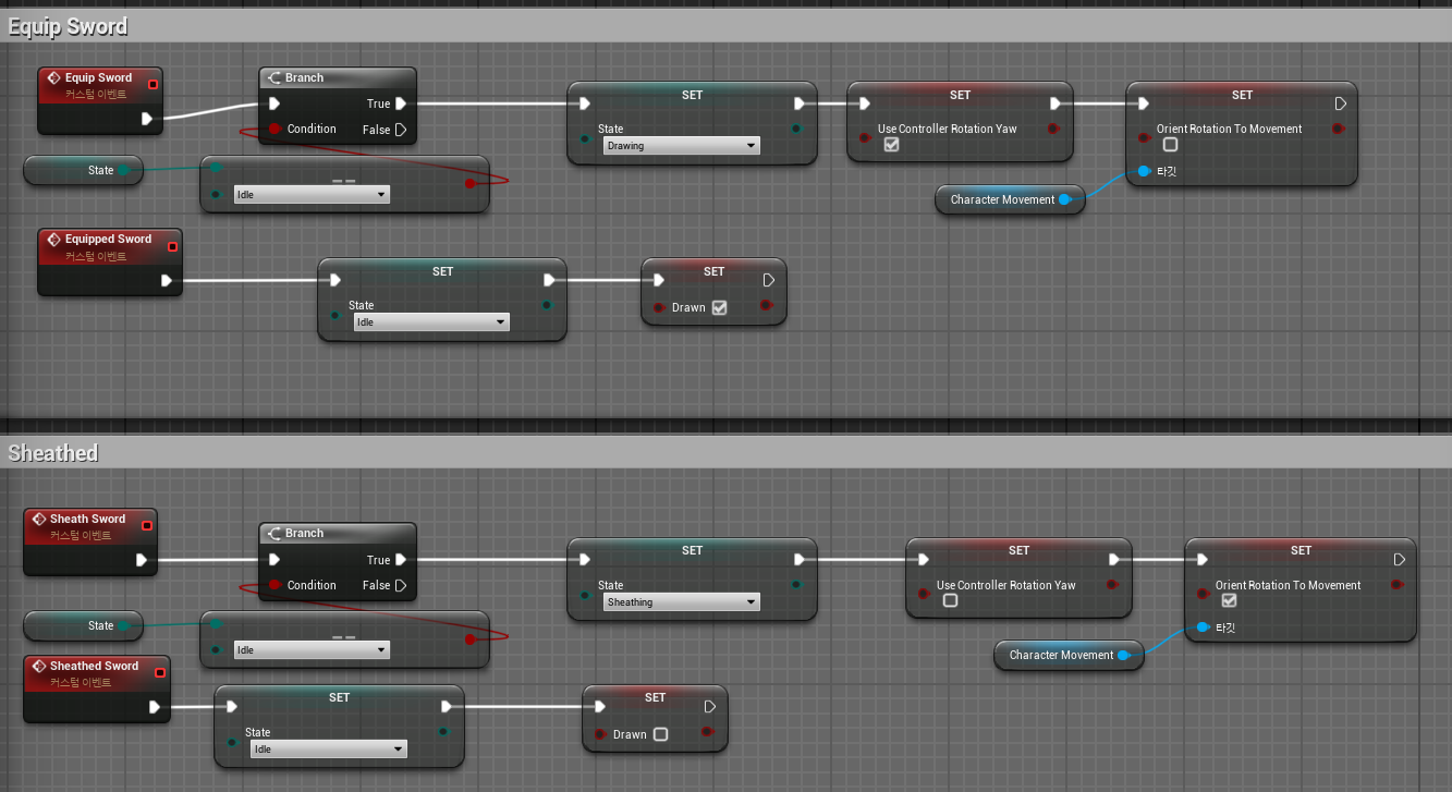 플레이어의 상태는, 기본값은 무기를 들던 아니던 Idle형태로 기본을 유지하고, Attacking은 공격중을 의미, Drawing은 무기를 드는과정, Sheathing은 무기를 다시 내려놓는 과정을 의미한다.