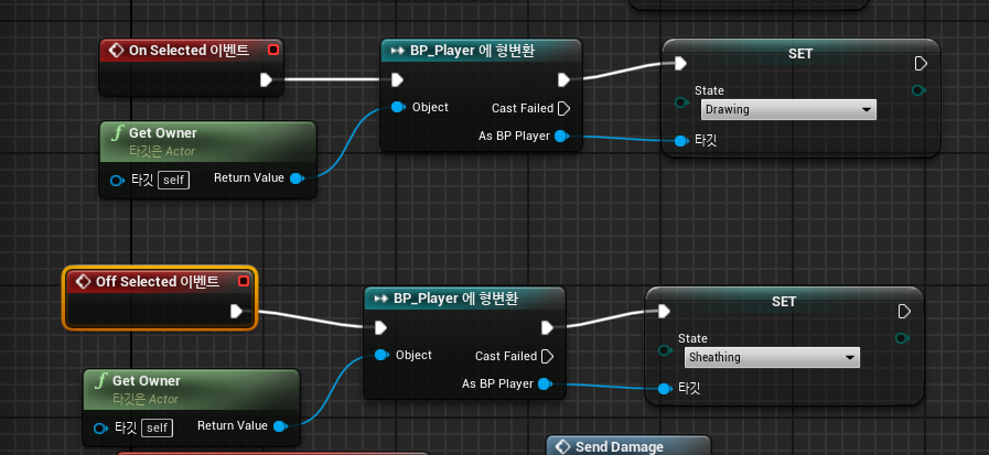 BP_Sword에서는 정해진 On Selected와 OffSelceted이벤트가 실행되었을 때의 이벤트를 재정의해주어야 한다.