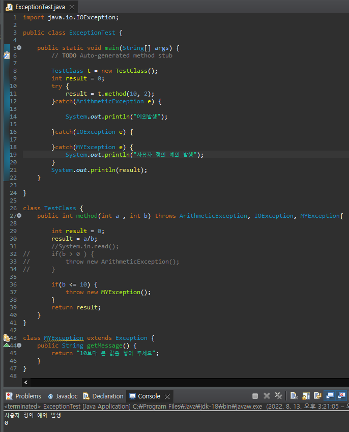 - 메서드에서 thorws를 통해 예외를 전달하면 메서드를 호출하는 쪽은 예외 처리 블록을 이용해 반드시 예외를 처리해줘야 한다.