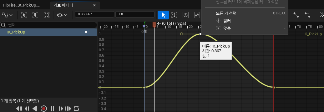 이 때 위의 ABP에서 사용되는 Alpha값은 1이 최대, 0이 최소 이기 때문에 무기를 줍는 순간이 1이되도록 한 뒤에 필터값을 선형이 아닌 곡선으로 넣어주면 된다.
